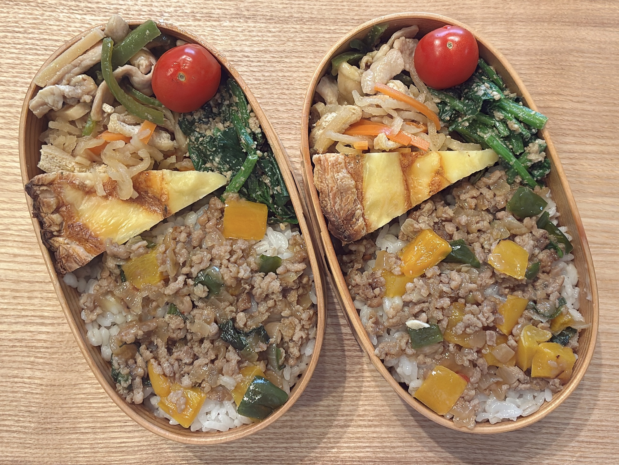 青椒肉絲はこちらで担当。ご飯はいつもと趣向を変えてガパオライスにしてみた。エスニック系とフレンチ系が同居するなかなかカオスなわっぱ弁当だが、食べてみると意外とまとまりがあった。これで午後も頑張れそうだ^_^
