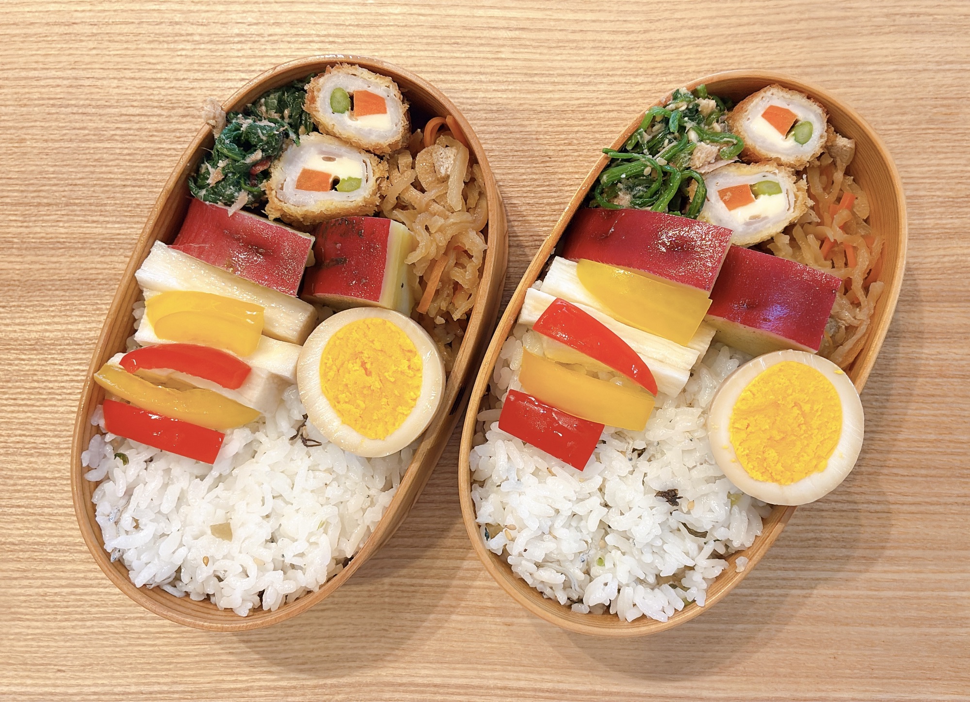 副菜は栄養バランスを考えて、緑黄色野菜をメインに5品用意。ほうれん草とツナの胡麻味噌は、胡麻の風味が効いて白ご飯がすすみます。長芋とパプリカの白だし漬けは、さっぱりとした口当たりで箸休めにピッタリ。切り干し大根は妻直伝のレシピで、優しい甘みがホッとします。