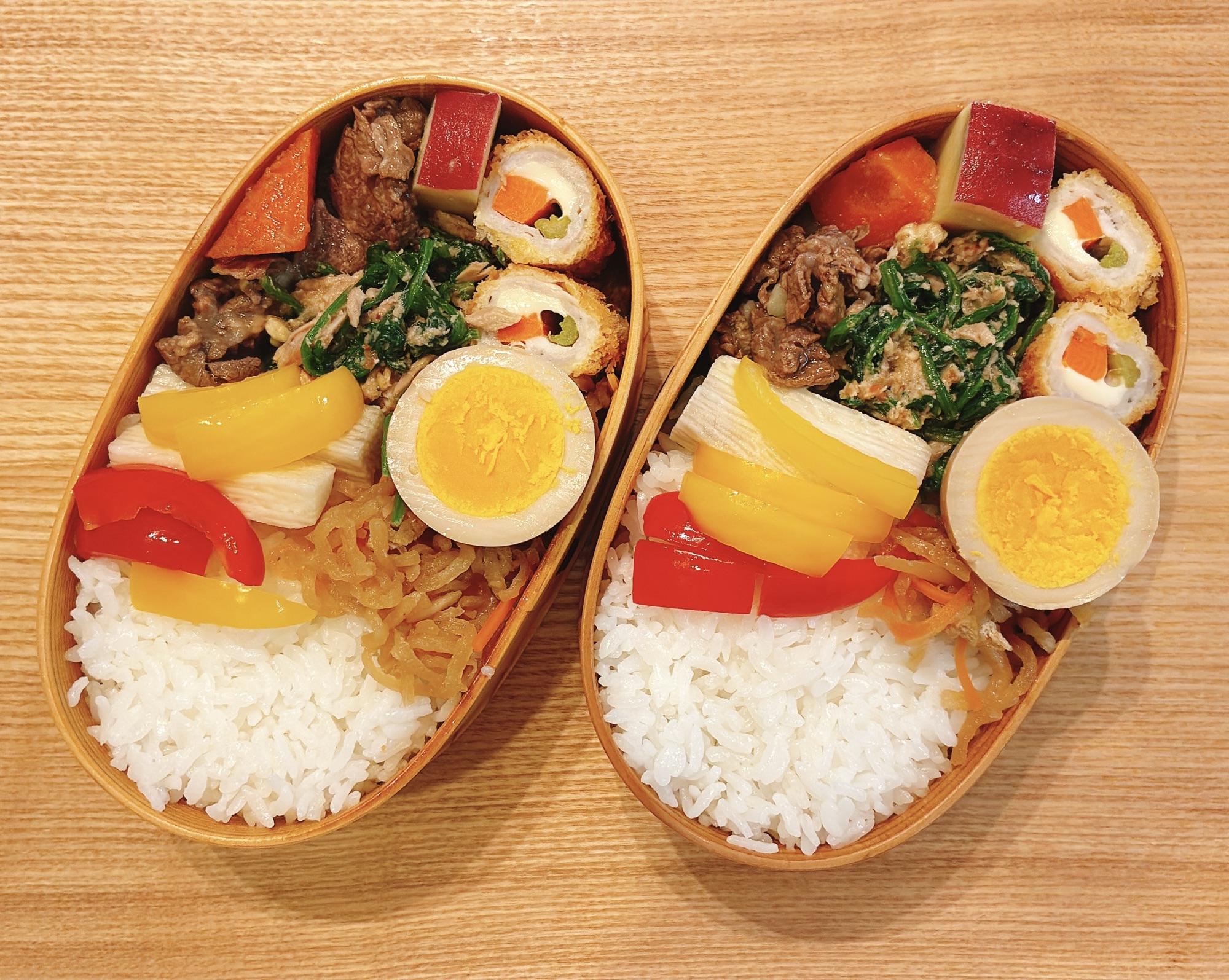 朝からせっせと詰め込んだわっぱ弁当、今日も無事完成しました。50代のおじさんが作る手作り弁当、見た目はともかく愛情はたっぷりです。