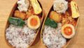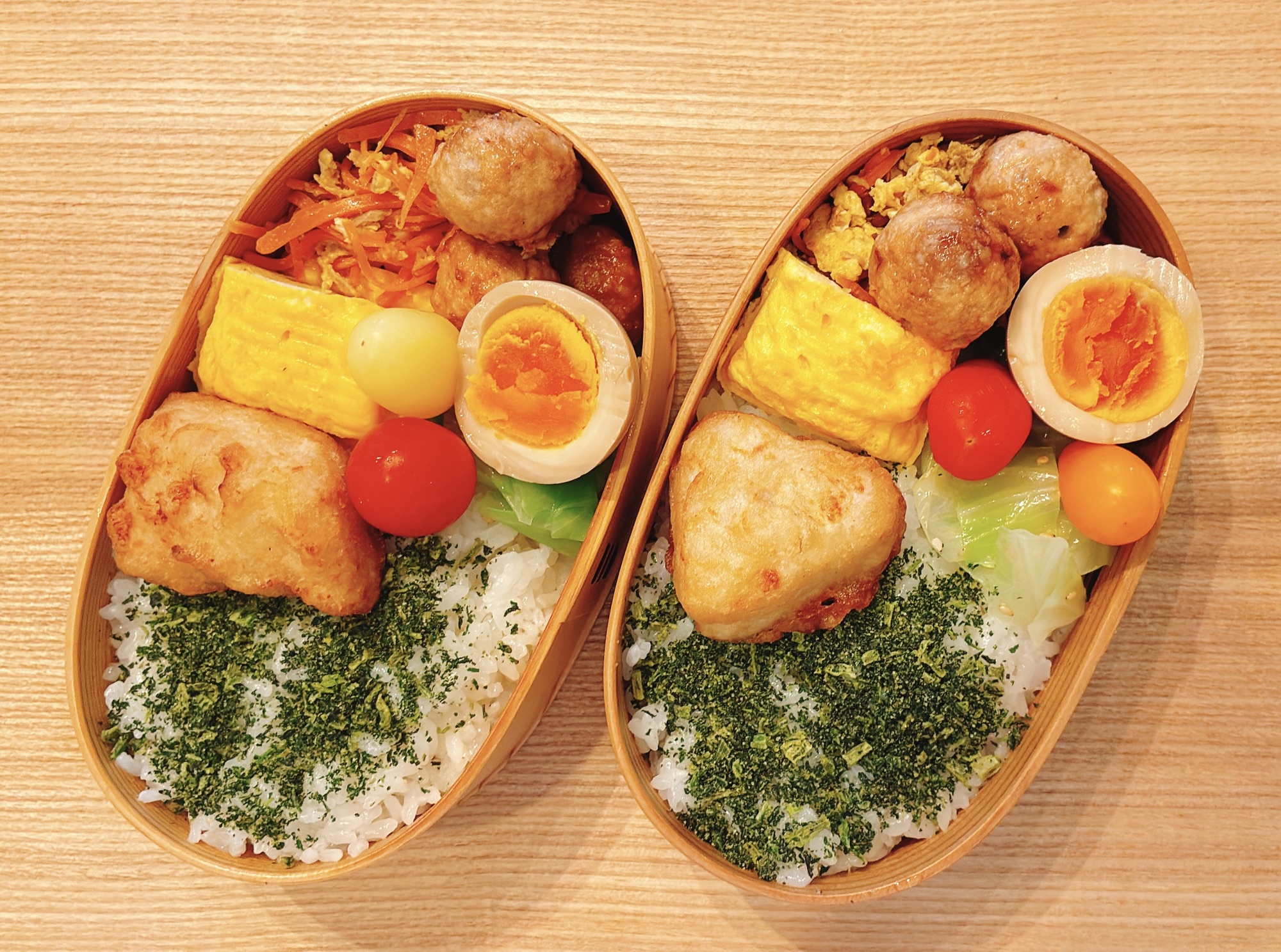 ニチレイのむねからとケイエス食品の鶏つくね串は、レンジでチンするだけで立派なメイン料理に。忙しい朝の強い味方です。副菜は前日に作り置きしたものを詰めるだけ。切り干し大根とキャベツのナムルで野菜もしっかり摂取。玉子焼きと味付け玉子でタンパク質も補給しました。
