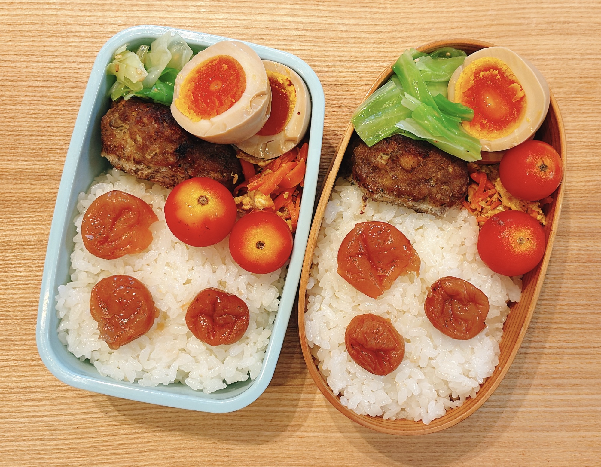 今日のメインはハンバーグ。実は昨日の晩ご飯から取り分けたものなんです。材料を少し多めに買って、夕食と翌日のお弁当用に作り置きしておくのがたつみくん流。朝の時短テクニックとして重宝しています。