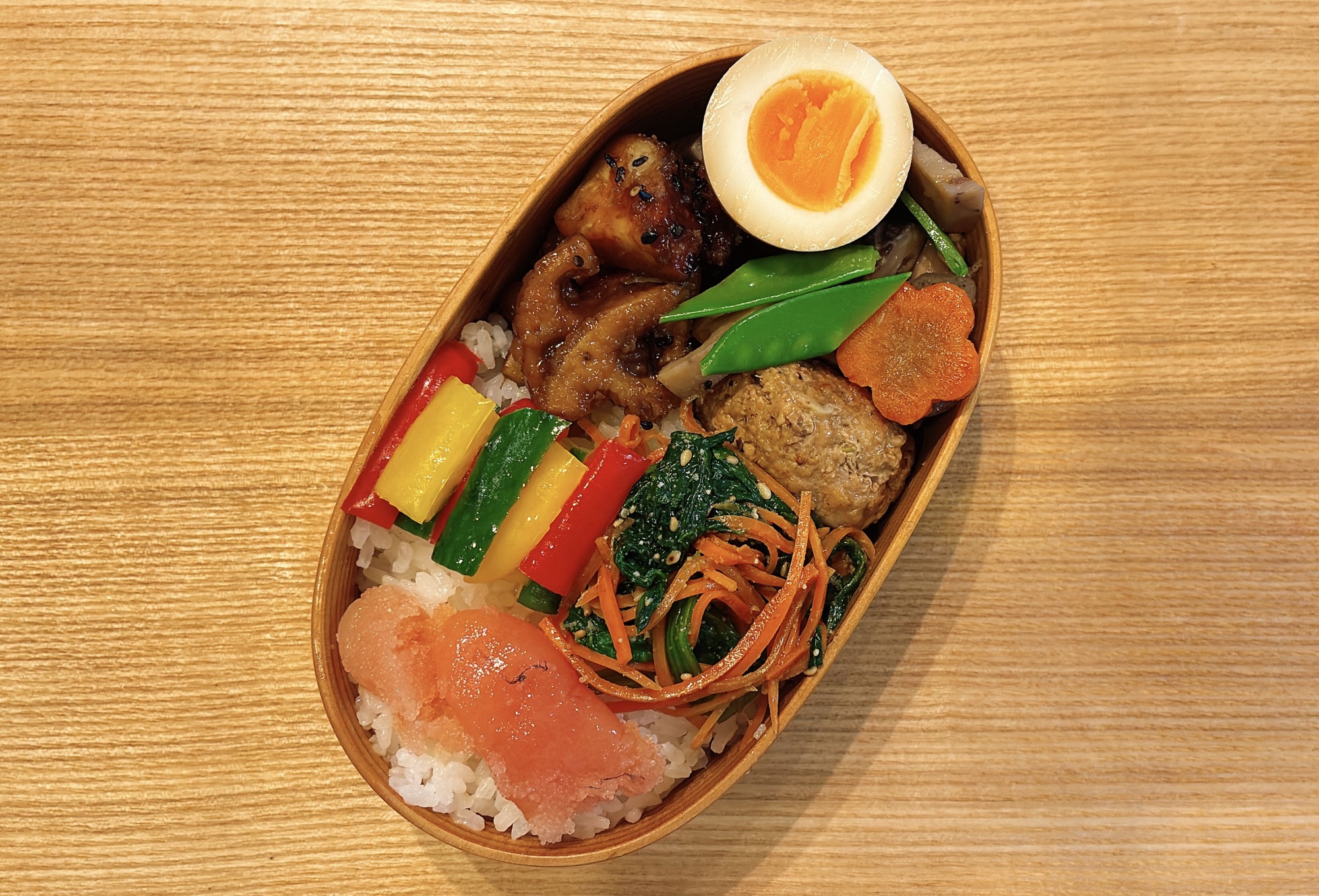 彩りを考えて、きゅうりとパプリカのピクルスを添えました。酸味が食欲をそそります。ほうれん草とにんじんのナムルは、ごま油の香りが食欲をそそる一品。味付け玉子は、わっぱ弁当の定番ですね。