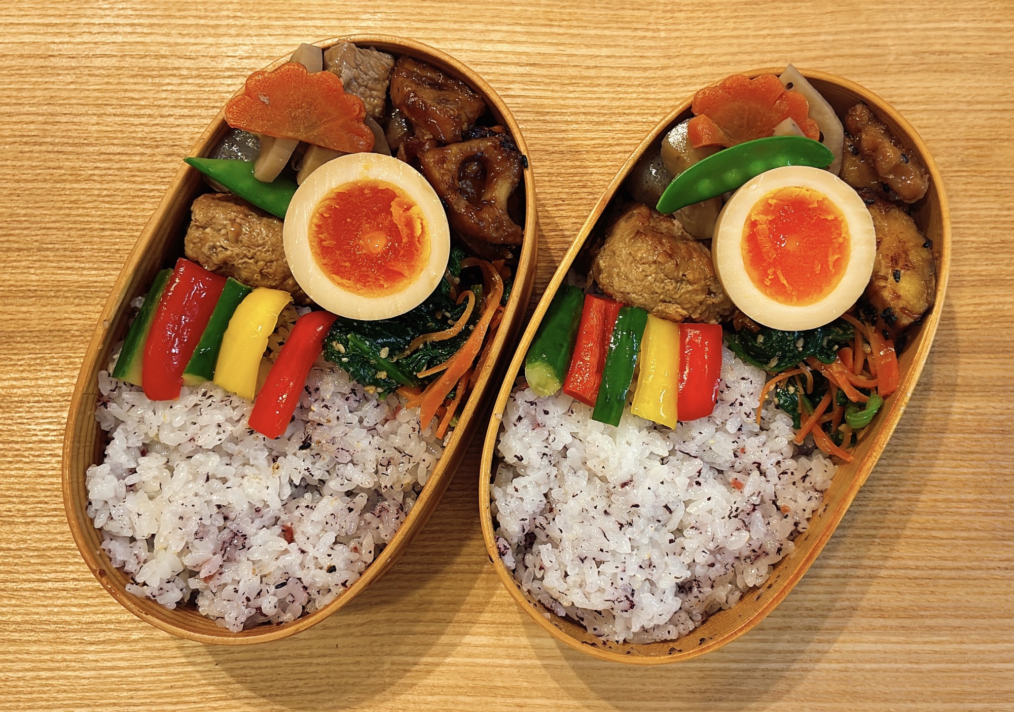 ほうれん草とにんじんのナムルは、ごま油の香りが食欲をそそります。きゅうりとパプリカのピクルスは作り置きしておいた自家製。酸味がお弁当全体を引き締めてくれる名脇役です。味付け玉子は半熟具合が絶妙に仕上がりました。