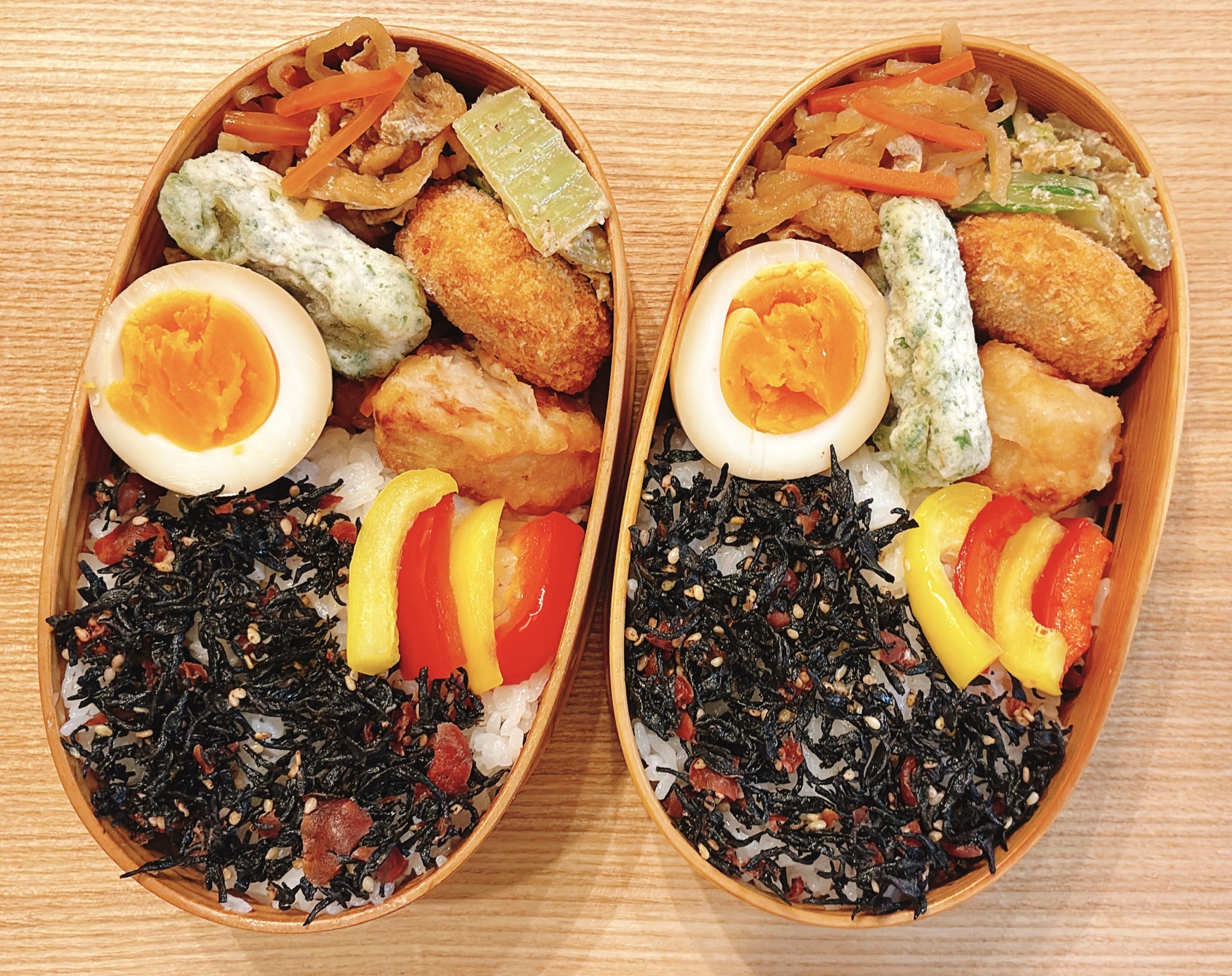 ご飯は梅の実ひじきごはんにしました。梅の酸味とひじきのミネラルが疲れた体に染み渡ります。わっぱ弁当箱に詰めると、見た目も美しく仕上がって満足度が高いです。