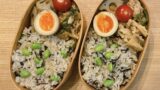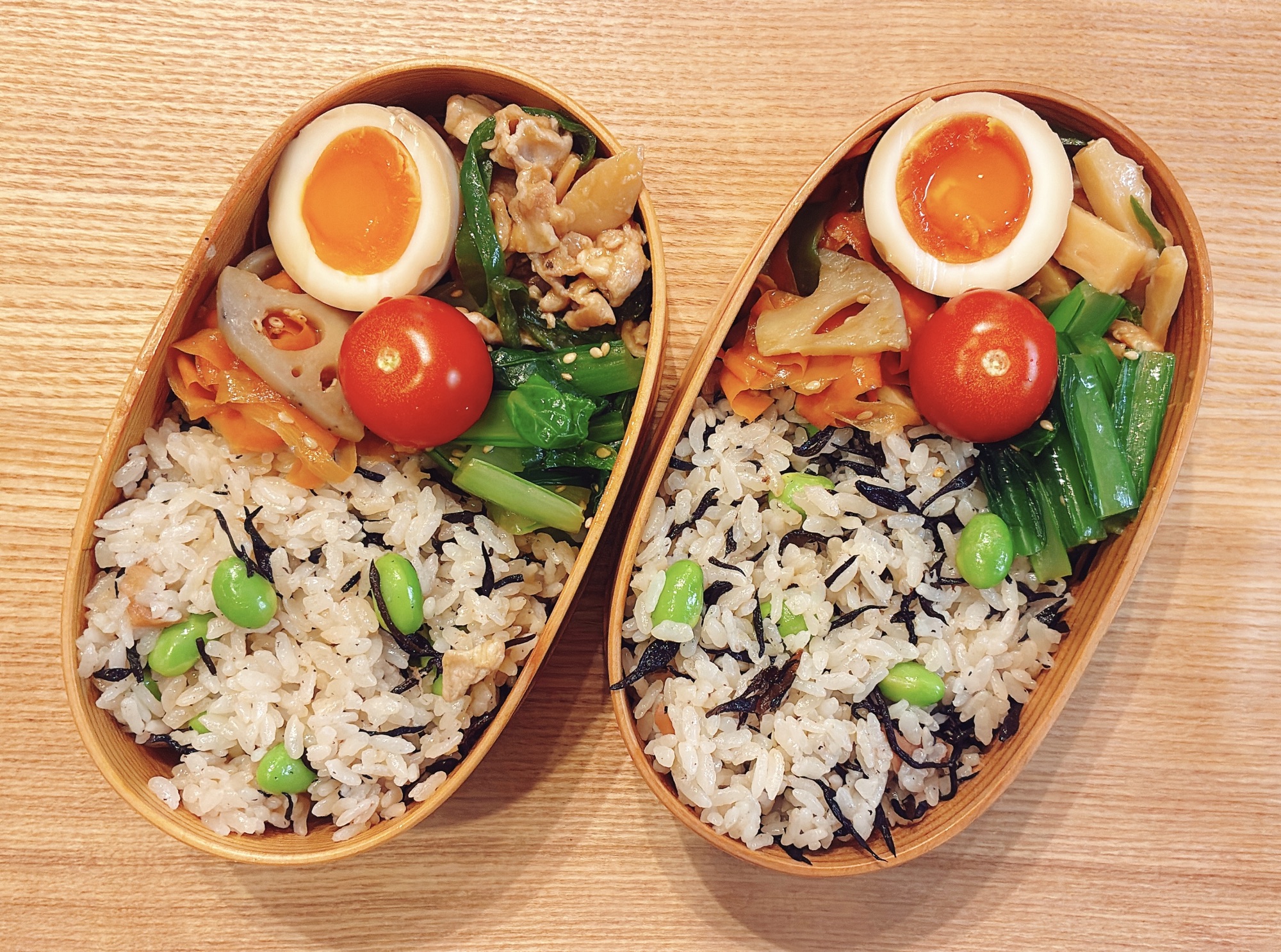 炊き込み御飯は味がしっかりついているので、おかずとのバランスも良く、わっぱ弁当にぴったり。磯の香りが食欲をそそり、梅の酸味が口の中をさっぱりとさせてくれます。枝豆の緑色も彩りに一役買ってくれて、見た目にも美味しそうに仕上がりました。